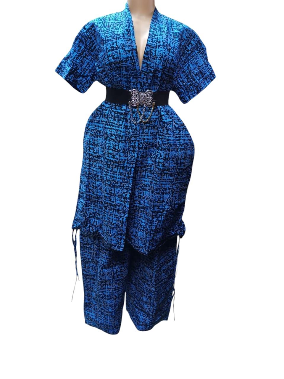 1.Material: 100% cotton Ankara (wax print) 2.Top: Long kimono with optional waist belt 3.Bottom: Full-length palazzo pants with elastic 4.