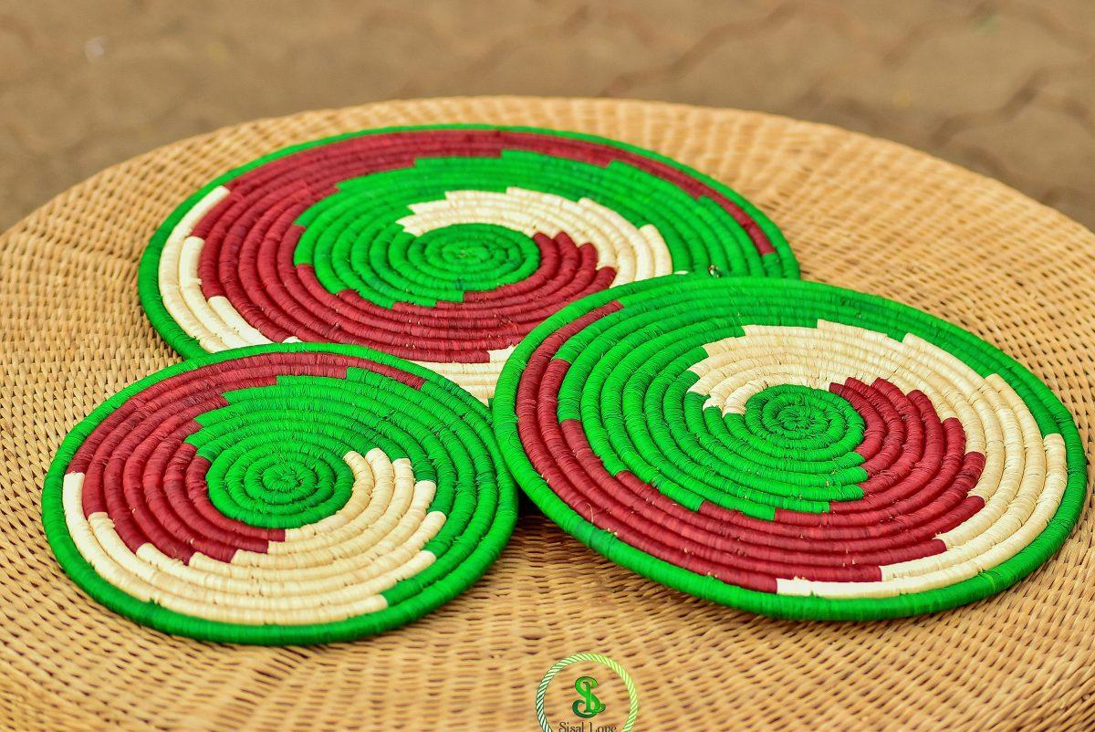 Banana riddle and raffia is cut into strips and dried out into the sun. The raffia is dyed using natural pigments from plants and vegetables and left out to dry again. The artisans then finely coil-sew them to create one-of-a-kind designs.They come in a variety of sizes and colours, hence giving our buyers a range of options for their spaces’ theme colours